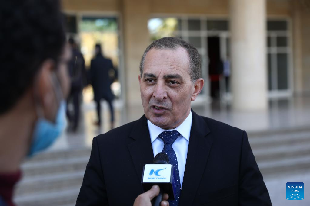 Mohamed Shabaan, vice-chairman of the Suez Canal Economic Zone (SCZone), is interviewed with Xinhua during a celebration of TEDA's launch of new projects at the China-Egypt TEDA Suez Economic and Trade Cooperation Zone in Suez province, Egypt, on Jan. 25, 2022. Chinese giant industrial developer TEDA celebrated on Tuesday the successful launch of new projects on logistic services and used-car import in China-Egypt TEDA Suez Economic and Trade Cooperation Zone in northeastern Egypt. (Xinhua/Ahmed Gomaa)