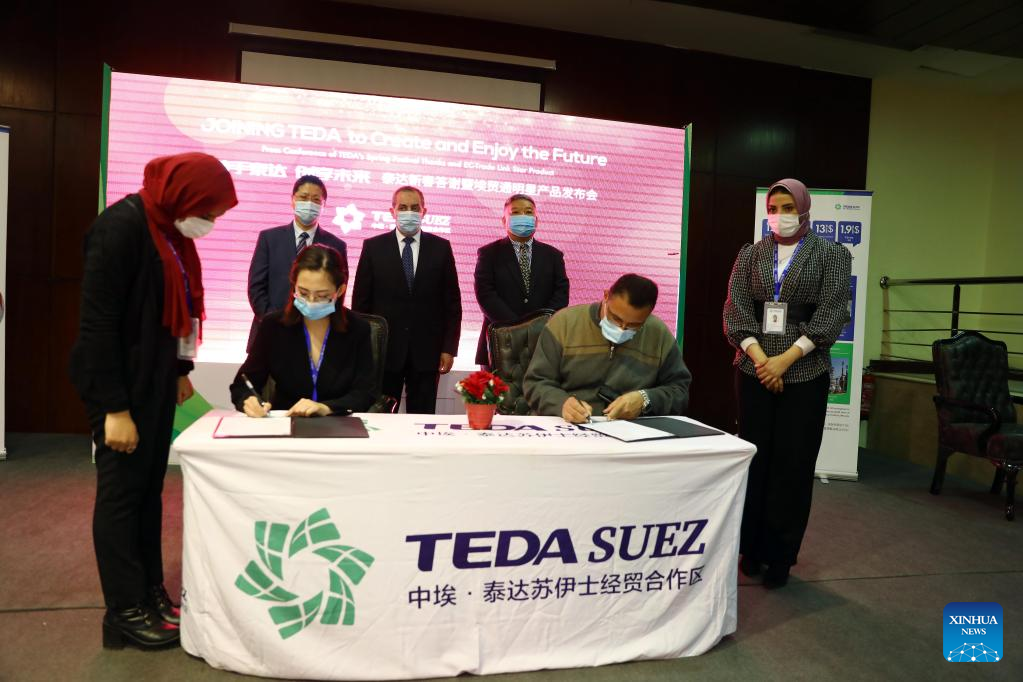 A signing ceremony of a host of cooperative agreements between TEDA and local enterprises is held during a celebration of TEDA's launch of new projects at the China-Egypt TEDA Suez Economic and Trade Cooperation Zone in Suez province, Egypt, on Jan. 25, 2022. Chinese giant industrial developer TEDA celebrated on Tuesday the successful launch of new projects on logistic services and used-car import in China-Egypt TEDA Suez Economic and Trade Cooperation Zone in northeastern Egypt. (Xinhua/Ahmed Gomaa)