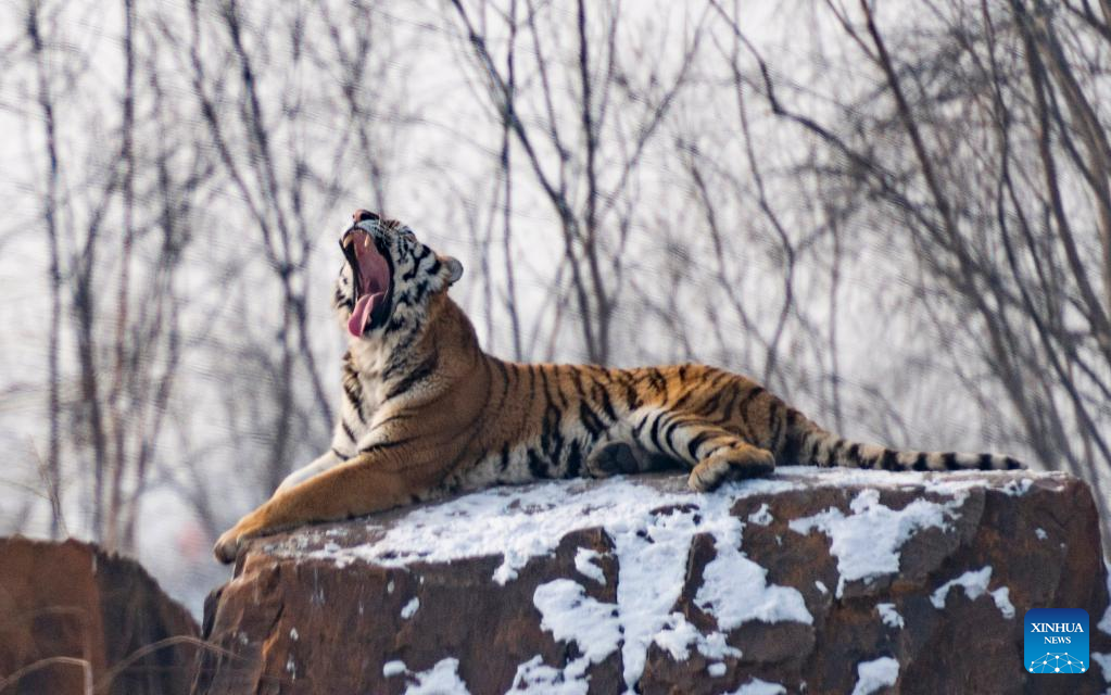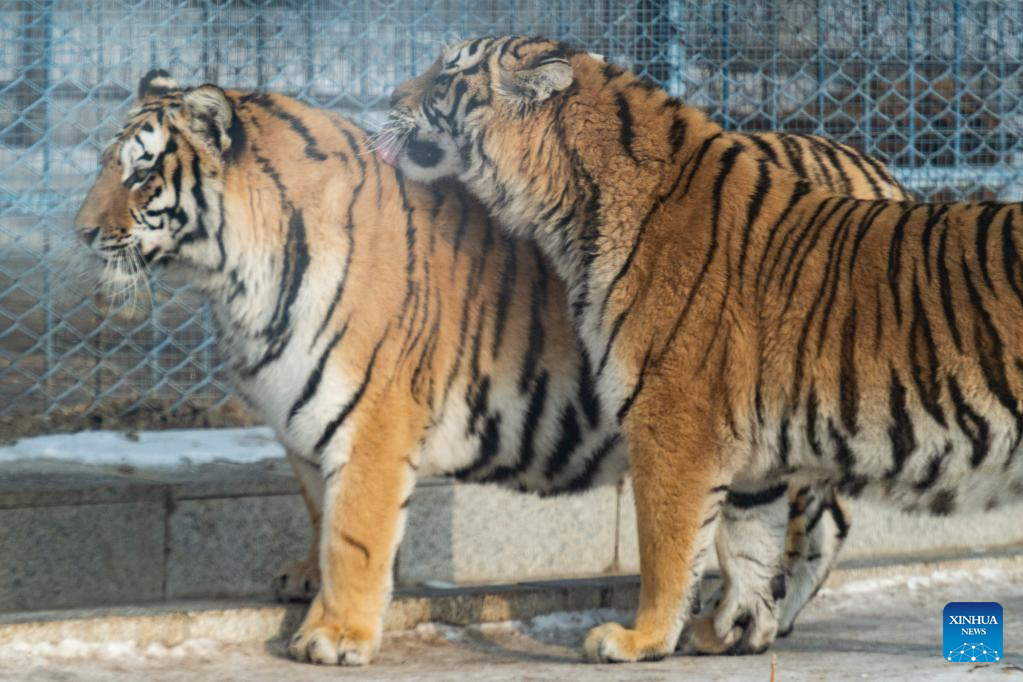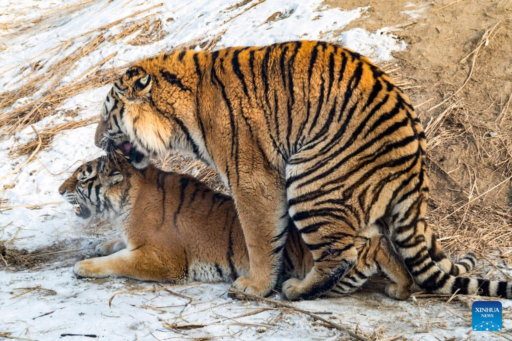 Photo taken on Jan. 25, 2022 shows Siberian tigers at the Siberian Tiger Park in northeast China's Heilongjiang Province. (Xinhua/Xie Jianfei)