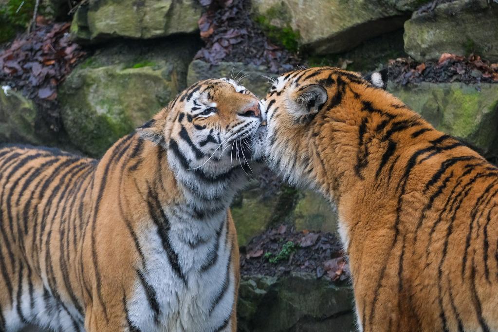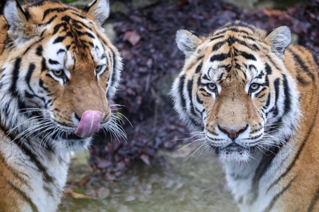 Photo taken on Jan. 26, 2022 shows two Siberian tigers at the Pairi Daiza zoo in Brugelette, Belgium. The upcoming Chinese Lunar New Year, the Year of the Tiger, falls on Feb. 1 this year. (Xinhua/Zhang Cheng)