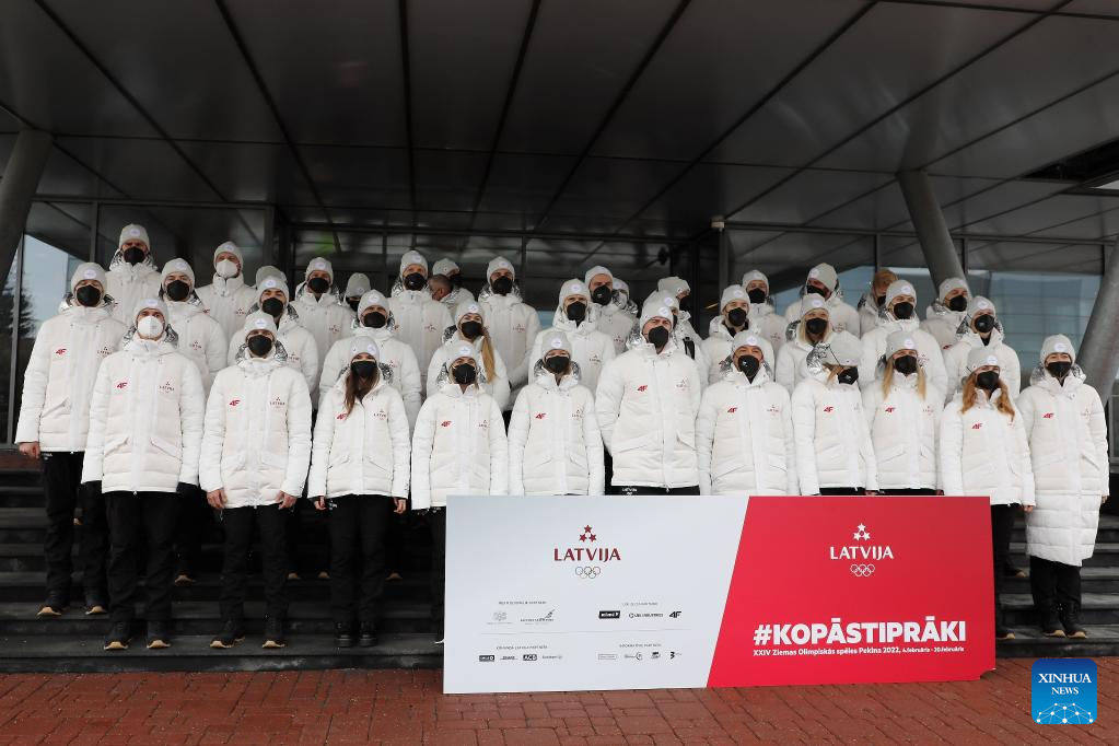 The first group 20 athletes of Latvia's delegation for Beijing 2022 Olympic Winter Games pose for a photo at Riga international airport during a media event in Riga, Latvia, Jan. 26, 2022. (Photo by Edijs Palens/Xinhua)