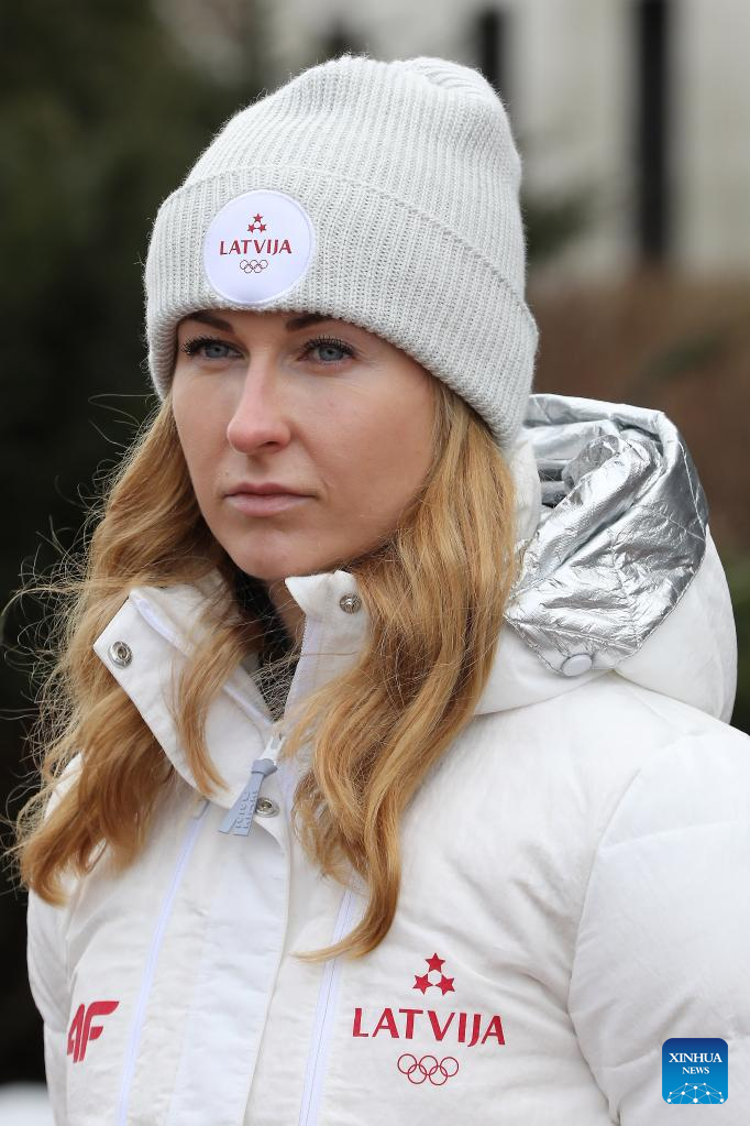 Latvia's Eliza Tiruma reacts during a media event before heading for Beijing 2022 in Riga, Latvia, Jan. 26, 2022. (Photo by Edijs Palens/Xinhua)