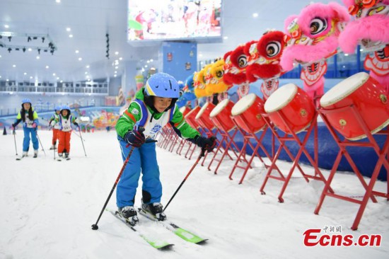 Children ski at the Sunac Snow Park in Kunming, southwest China's Yunnan Province, Jan. 26, 2022. (Photo: China News Service/Liu Yanyang)