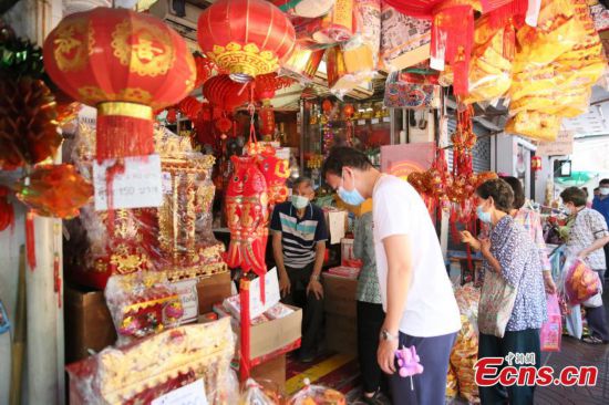 Customers buy New Year decorations at a shop in Chinatown in Bangkok, Thailand, Jan. 26, 2022. (Photo: China News Service/Wang Guoan)
