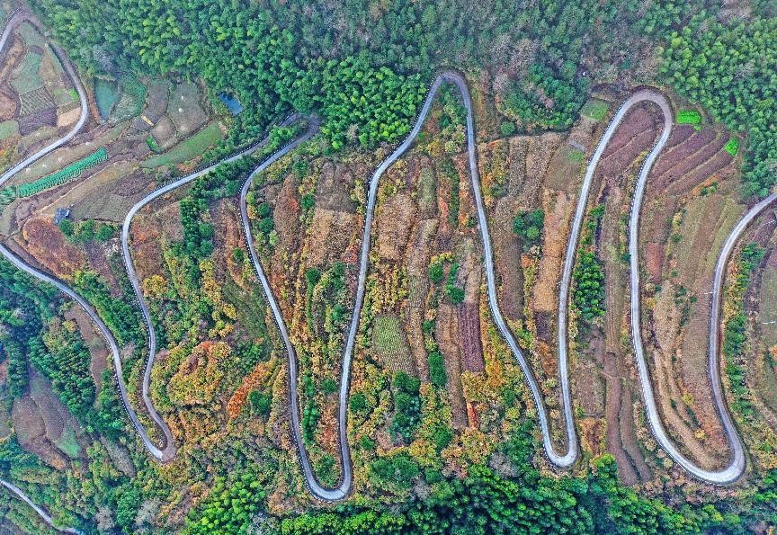 Photo taken on Jan. 5, 2022 shows a road winding on a mountain in Xianju county, Taizhou, east China’s Zhejiang province. (People’s Daily Online/ Wang Huabin)