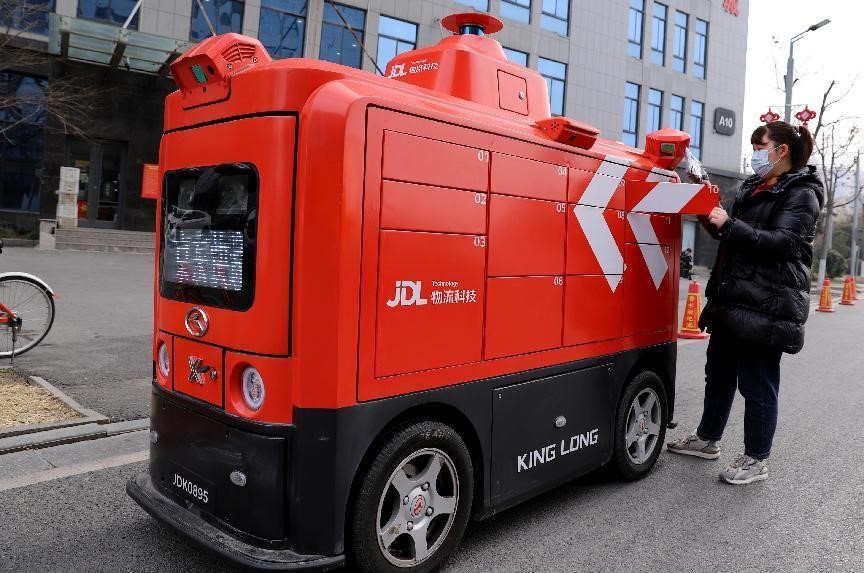 A woman collects her parcel from a smart courier vehicle in Suyu district, Suqian, east China’s Jiangsu province, Jan. 19, 2022. (People’s Daily Online/ Sun Dongcheng)