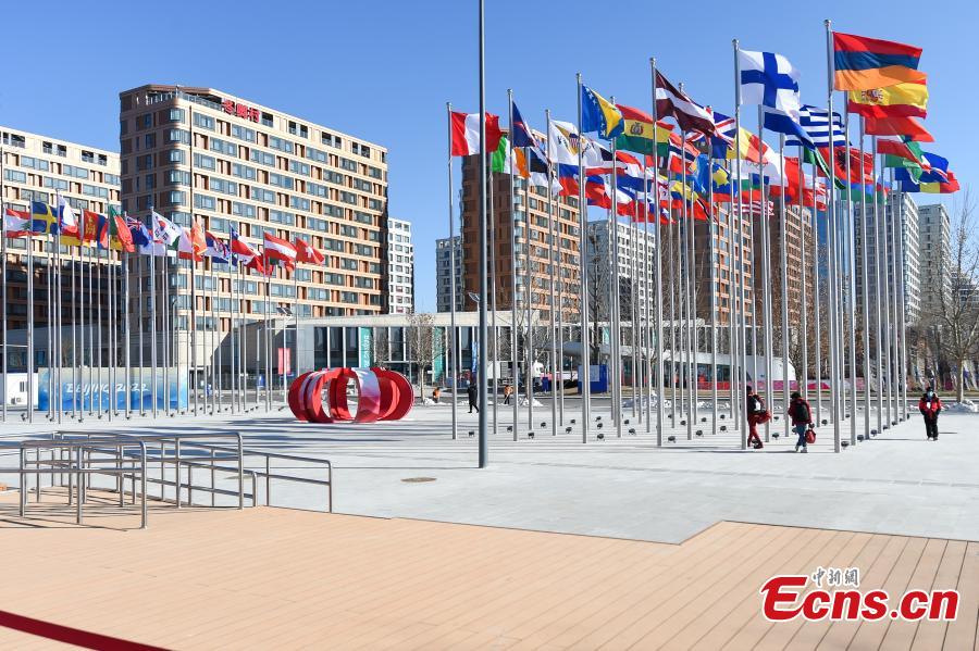 Flags fly at the square of the Olympic Villages for the Beijing 2022 Olympic Winter Games in Beijing, capital of China, Jan. 27, 2022. (Photo: China News Service/He Penglei)