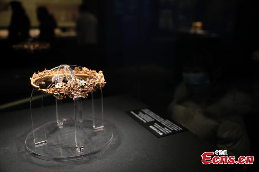 Visitors view a jewel-encrusted gold crown of the Han Dynasty (206 BC-220 AD) at Chengdu Museum in Chengdu, southwest China's Sichuan province, Jan. 27, 2022. (Photo: China News Service/Wang Lei)