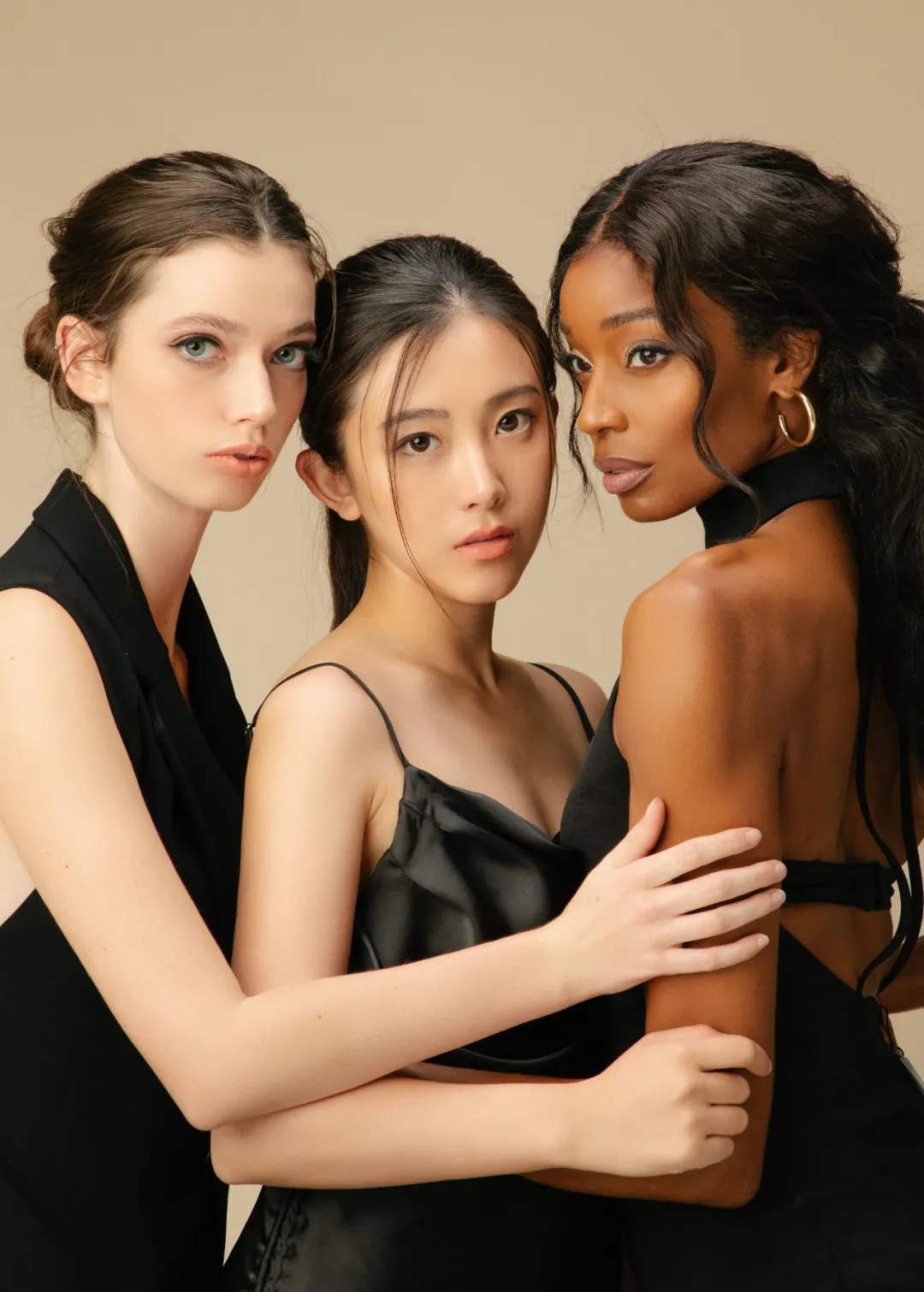 In one photo, a Chinese model stands next to two other models, one of African descent and the other being Caucasian.