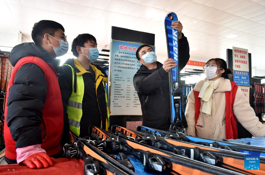 Yang Xubo explains maintenance techniques of skiing gears at a ski resort in Xingtai, north China's Hebei Province, Jan. 27, 2022. Yang Xubo is a winter sports enthusiast in Xingtai. In 2018, he started a ski resort business. Yang believes that his 40000-square-meter ski resort will help promote winter sports among people. (Xinhua/Zhu Xudong)