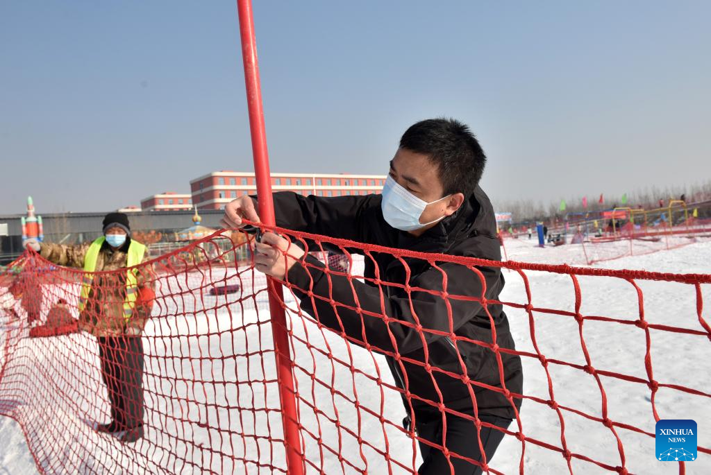 Yang Xubo maintains safety nets at a ski resort in Xingtai, north China's Hebei Province, Jan. 27, 2022. Yang Xubo is a winter sports enthusiast in Xingtai. In 2018, he started a ski resort business. Yang believes that his 40000-square-meter ski resort will help promote winter sports among people. (Xinhua/Zhu Xudong)