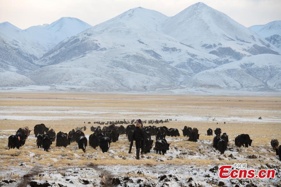 Herdsmen graze their livestock in the snow in Wuda village of Damxung county, southwest China's Tibet Autonomous Region, Jan. 27, 2022. (Photo/China News Service)
