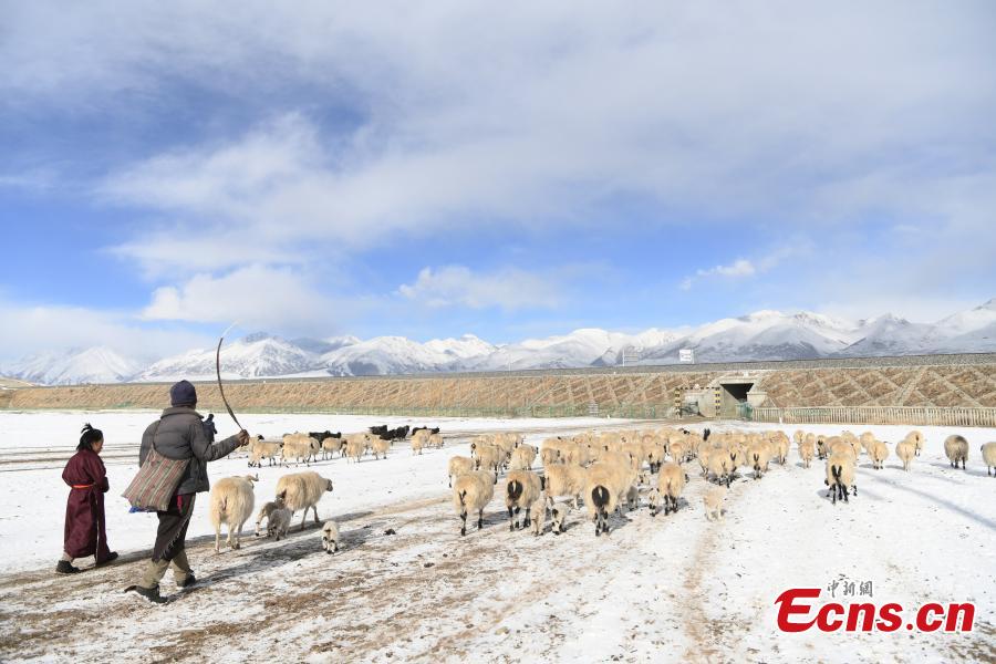 Herdsmen graze their livestock in the snow in Wuda village of Damxung county, southwest China's Tibet Autonomous Region, Jan. 27, 2022. (Photo/China News Service)