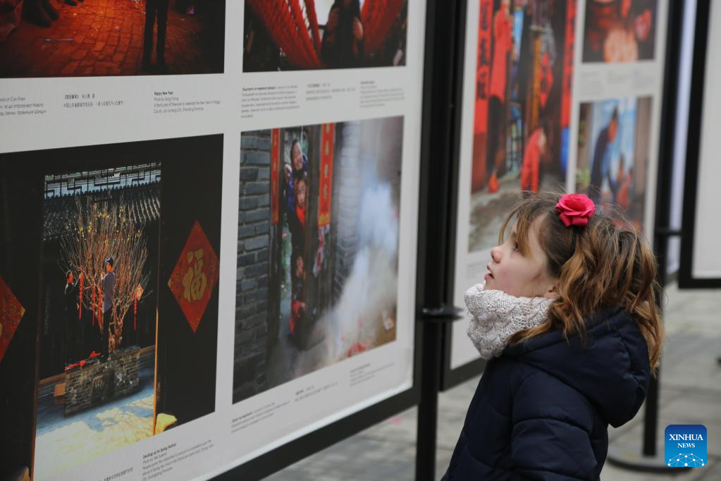 A girl visits a Chinese New Year photo exhibition in Sofia, Bulgaria, on Jan. 28, 2022. The Chinese New Year photo exhibition opened here on Friday, featuring 65 photos, which show how Chinese people in different parts of the country celebrate the Chinese Lunar New Year, or the Spring Festival, which falls on Feb. 1. (Xinhua/Lin Hao)