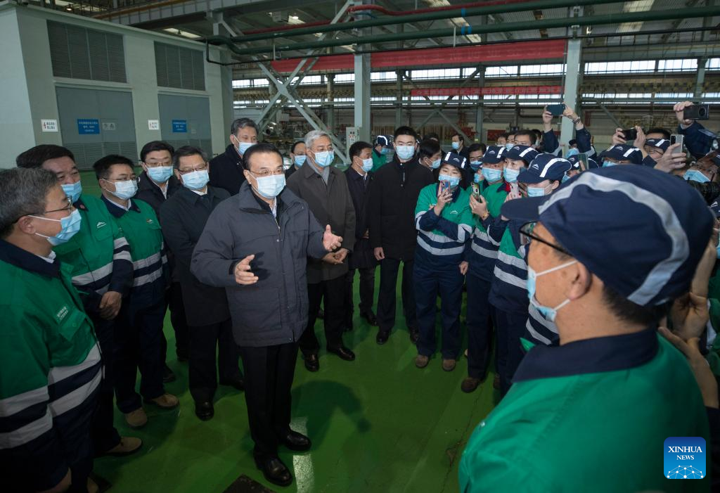 Chinese Premier Li Keqiang, also a member of the Standing Committee of the Political Bureau of the Communist Party of China Central Committee, visits a non-ferrous metals company in northwest China's Gansu Province, Jan. 28, 2022. Li visited Jinchang and Wuwei of Gansu Province from Thursday to Friday. (Xinhua/Wang Ye)