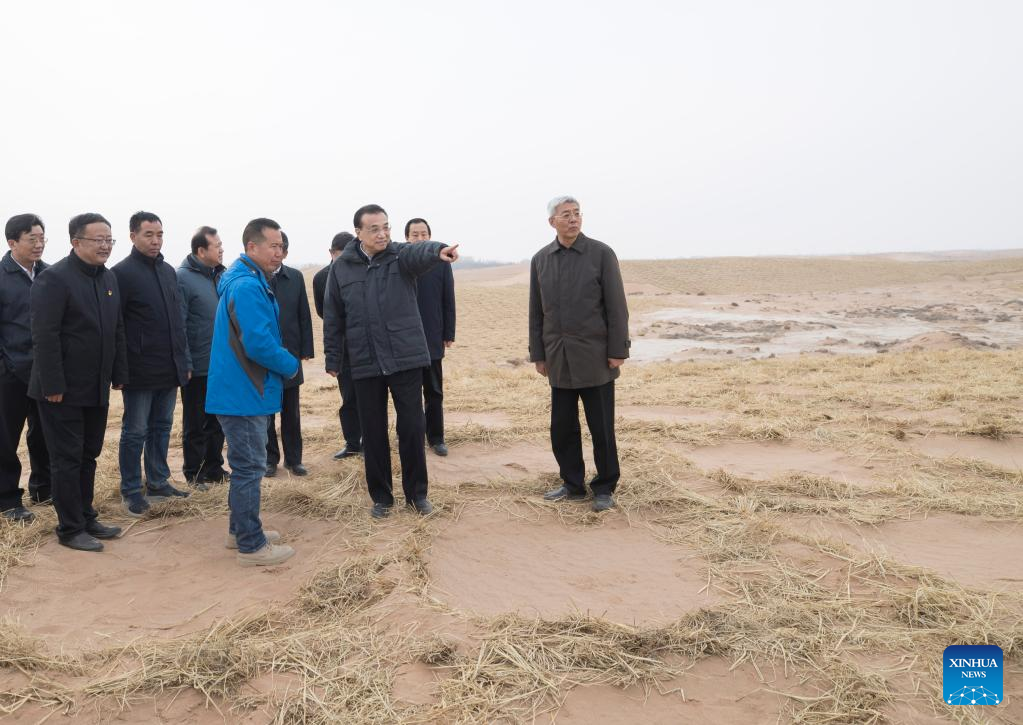 Chinese Premier Li Keqiang, also a member of the Standing Committee of the Political Bureau of the Communist Party of China Central Committee, learns about desertification control and management in Minqin County of Wuwei City, northwest China's Gansu Province, Jan. 27, 2022. Li visited Jinchang and Wuwei of Gansu Province from Thursday to Friday. (Xinhua/Wang Ye)