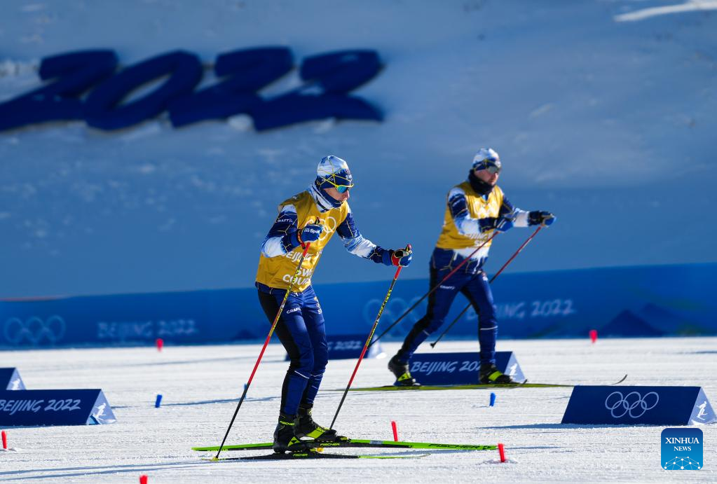 Skiers practise during a training session at Zhangjiakou National Cross-Country Skiing Centre in Zhangjiakou, north China's Hebei Province, Jan. 27, 2022. (Xinhua/Deng Hua)