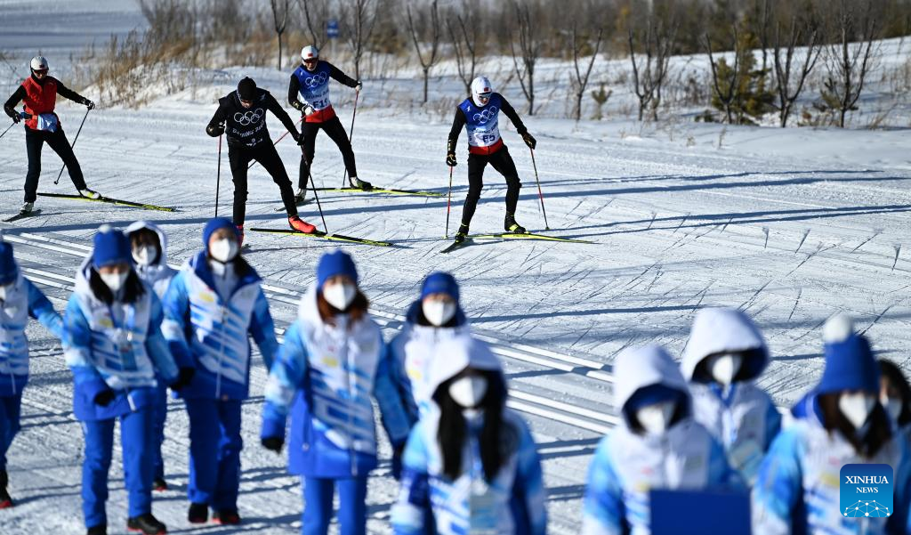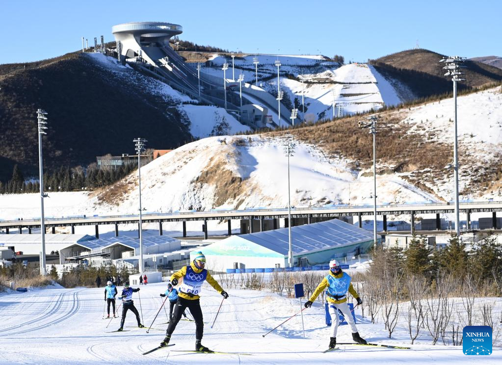 Skiers practise during a training session at Zhangjiakou National Cross-Country Skiing Centre in Zhangjiakou, north China's Hebei Province, Jan. 27, 2022. (Xinhua/Zhang Hongxiang)