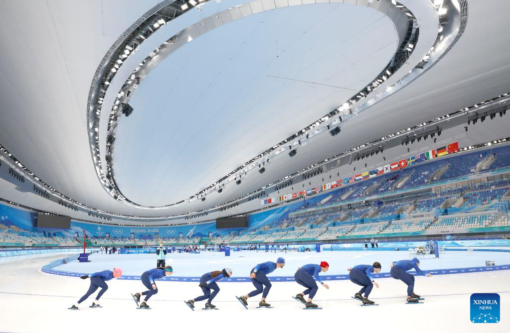 Athletes take part in a training session at the National Speed Skating Oval in Beijing, capital of China, Jan. 28, 2022. (Xinhua/Ding Xu)