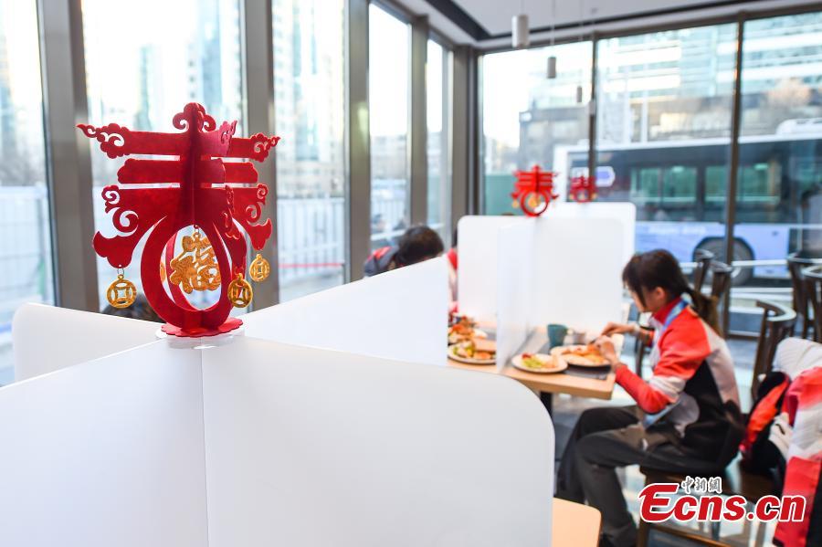 Photo taken on Jan. 27, 2022 shows a restaurant of contracted hotels for Winter Olympics decorated with Spring Festival elements. (Photo: China News Service/He Penglei)