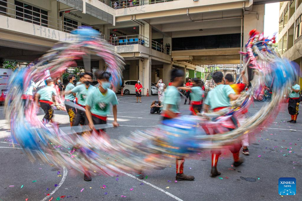 Actors perform dragon dance in Bangkok, Thailand, Jan. 27, 2022. The Jiangbei Dragon and Lion Dance Club held a performance to welcome the upcoming Spring Festival in Bangkok. (Xinhua/Wang Teng)