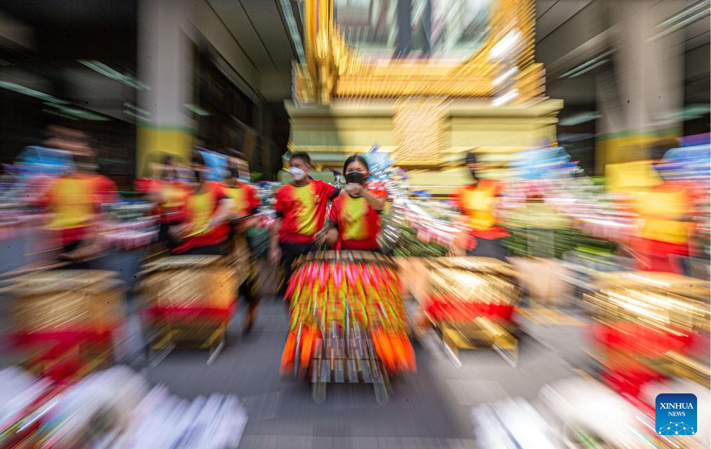Actors perform lion dance drum in Bangkok, Thailand, Jan. 27, 2022. The Jiangbei Dragon and Lion Dance Club held a performance to welcome the upcoming Spring Festival in Bangkok. (Xinhua/Wang Teng)