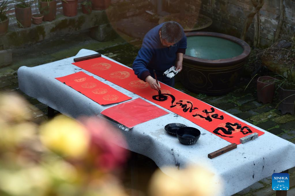 A man writes Spring Festival couplets in Huizhou District of Huangshan, east China's Anhui Province, Jan. 19, 2022. Southern Anhui has a rich culture that preserves many traditional folk customs. As the lunar new year approaches, locals write Spring Festival couplets and prepare various delicious delicacies to share the festive mood. (Xinhua/Zhou Mu)