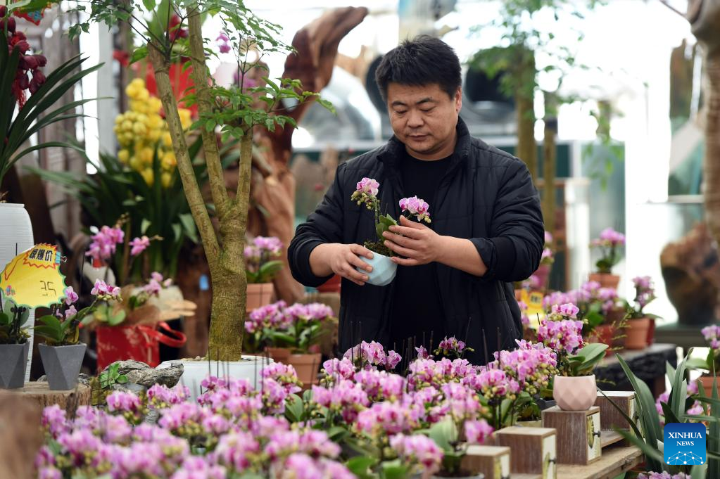 A man arranges flowers at a flower shop in Huizhou District of Huangshan, east China's Anhui Province, Jan. 19, 2022. Southern Anhui has a rich culture that preserves many traditional folk customs. As the lunar new year approaches, locals write Spring Festival couplets and prepare various delicious delicacies to share the festive mood. (Xinhua/Zhou Mu)
