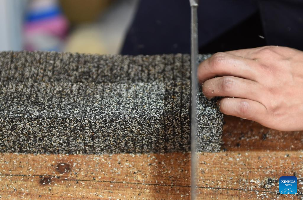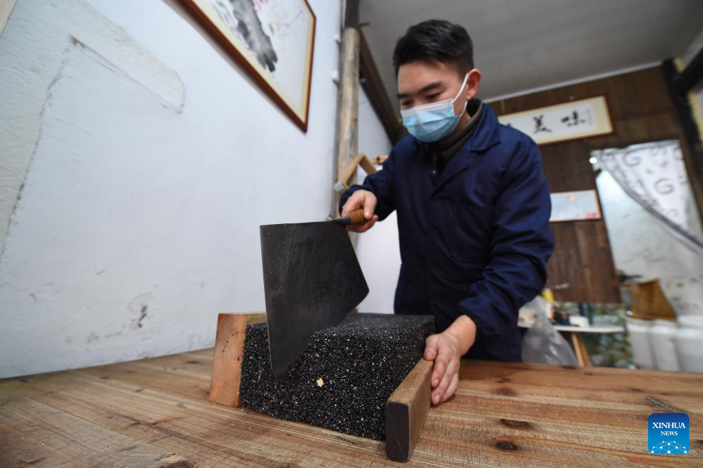 A man makes sesame candy in Huizhou District of Huangshan, east China's Anhui Province, Jan. 19, 2022. Southern Anhui has a rich culture that preserves many traditional folk customs. As the lunar new year approaches, locals write Spring Festival couplets and prepare various delicious delicacies to share the festive mood. (Xinhua/Zhou Mu)