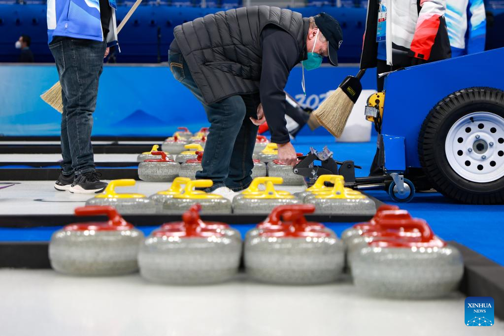 Hans Wuthrich adjusts ice-making facilities at the National Aquatics Center in Beijng, capital of China, Jan. 28, 2022. Hans Wuthrich, a Canadian professional ice technician of World Curling Federation, has been working for world-class curling competitions for years. This is the fourth Olympics for Wuthrich to work as a chief ice technician, responsible for ice-making work of four curling lanes in China's National Aquatics Center, also known as the Ice Cube. (Xinhua/Liu Xu)