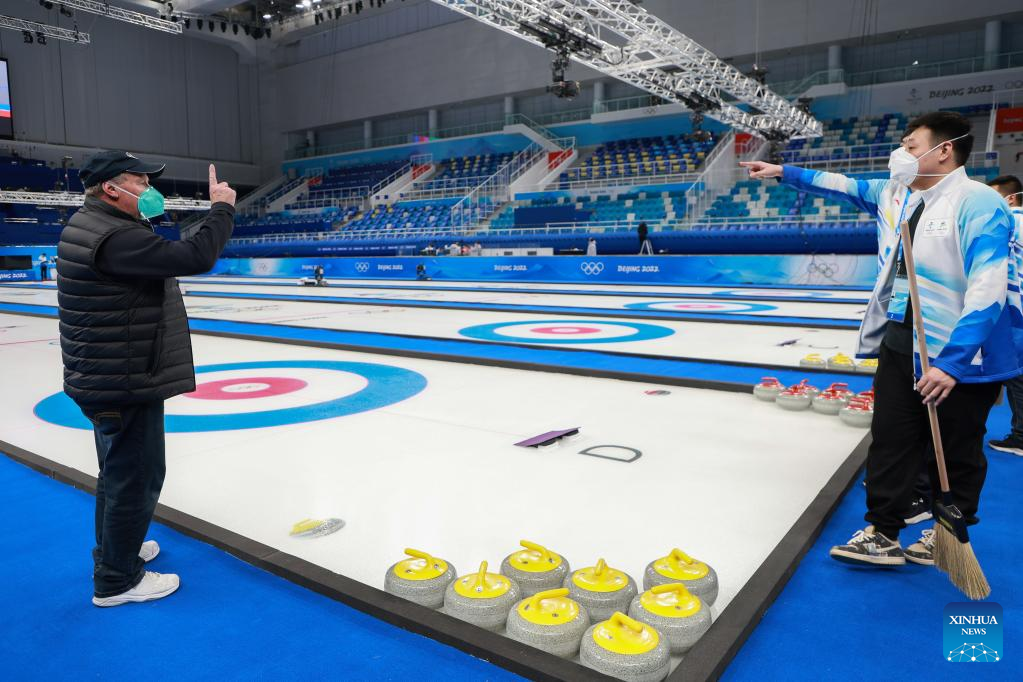 Hans Wuthrich (L) instructs ice-making work at the National Aquatics Center in Beijng, capital of China, Jan. 28, 2022. Hans Wuthrich, a Canadian professional ice technician of World Curling Federation, has been working for world-class curling competitions for years. This is the fourth Olympics for Wuthrich to work as a chief ice technician, responsible for ice-making work of four curling lanes in China's National Aquatics Center, also known as the Ice Cube. (Xinhua/Liu Xu)