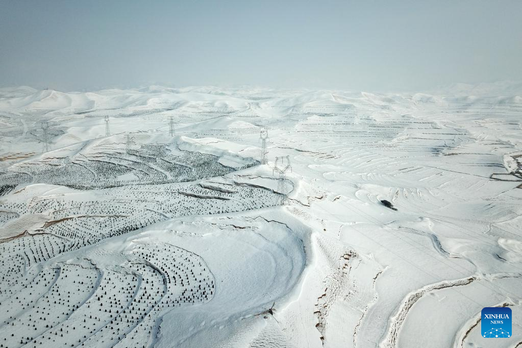 Aerial photo taken on Jan. 28, 2022 shows snow-covered mountains in Hezuo City in Gannan Tibetan Autonomous Prefecture, northwest China's Gansu Province. (Xinhua/Fan Peishen)