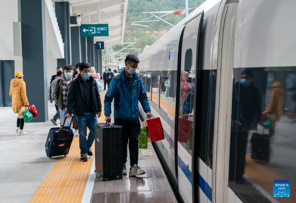 Passengers board a train at Xiaowandong railway station in Xiaowandong Township of Nanjian Yi Autonomous County, southwest China's Yunnan Province, Jan. 28, 2022.