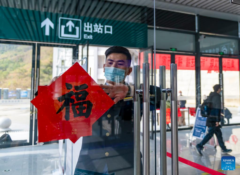 A staff member adorns a window with Spring Festival decorations at Xiaowandong railway station in Xiaowandong Township of Nanjian Yi Autonomous County, southwest China's Yunnan Province, Jan. 28, 2022.