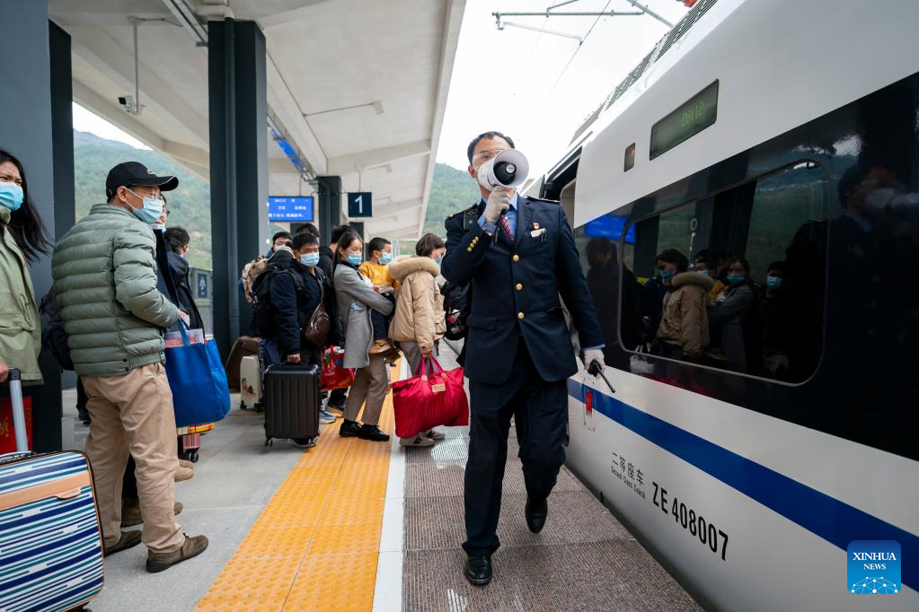 A staff member (R) guides passengers to board the train at Xiaowandong railway station in Xiaowandong Township of Nanjian Yi Autonomous County, southwest China's Yunnan Province, Jan. 28, 2022.