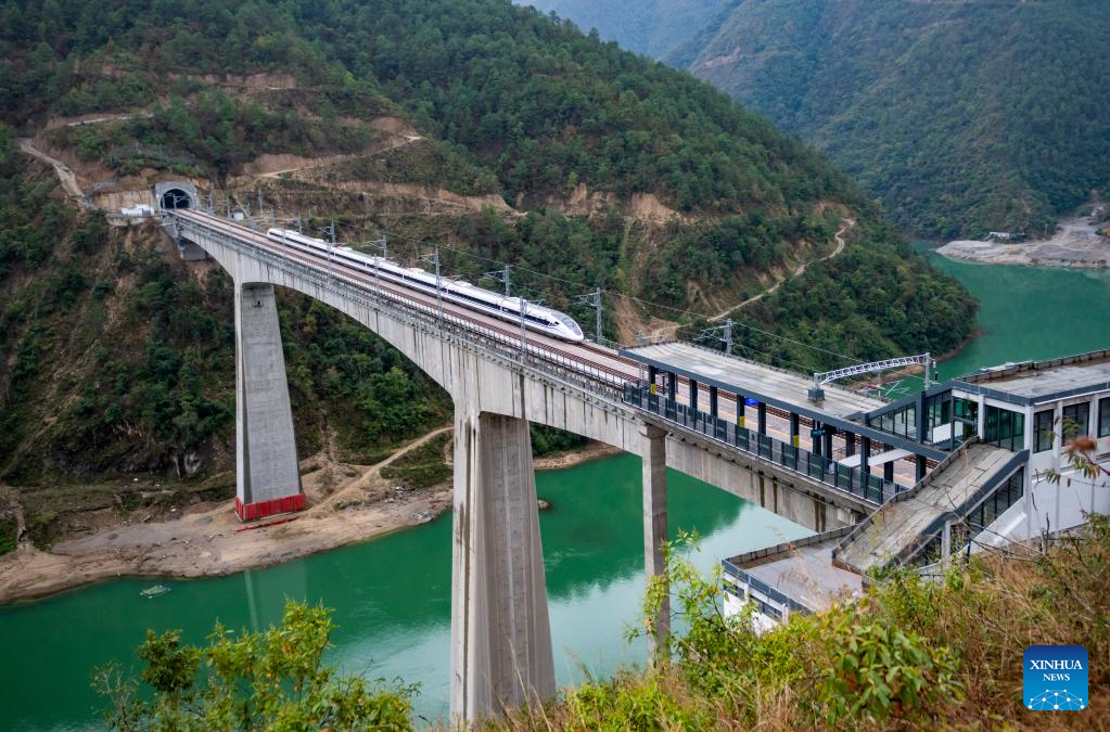 A high-speed train passes by Xiaowandong railway station in Xiaowandong Township of Nanjian Yi Autonomous County, southwest China's Yunnan Province, Jan. 28, 2022.