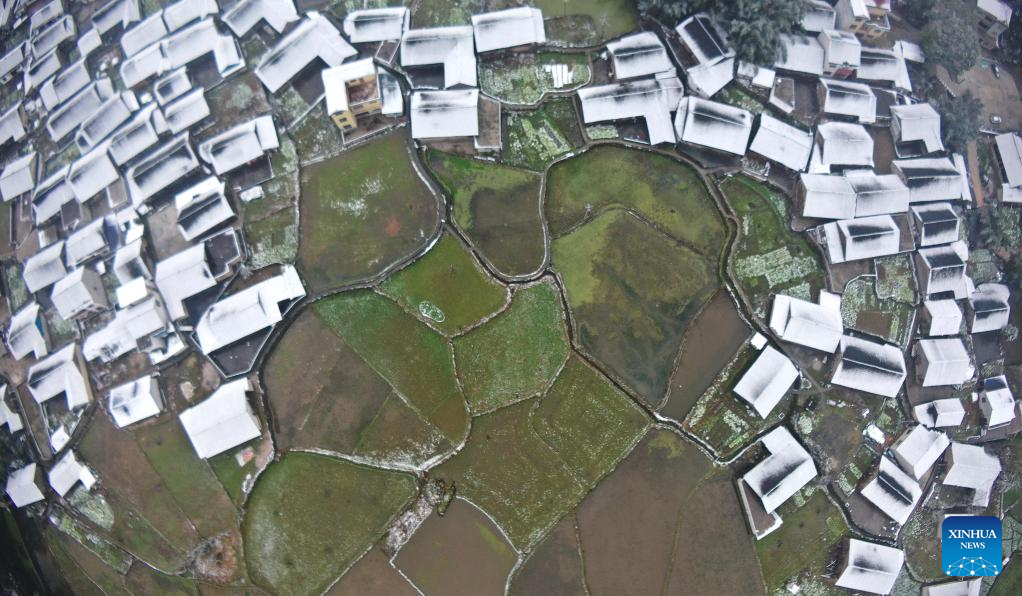 Aerial photo taken on Jan. 29, 2022 shows the scenery of snow-covered Shilan Village in Huayuan County of central China's Hunan Province. (Photo by Long Enze/Xinhua)