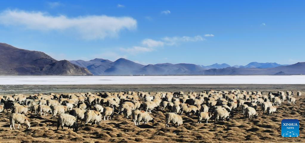 Photo taken on Jan. 28, 2022 shows a herd of sheep near the Yamzbog Yumco Lake in Shannan, southwest China's Tibet Autonomous Region. (Xinhua/Shen Hongbing)