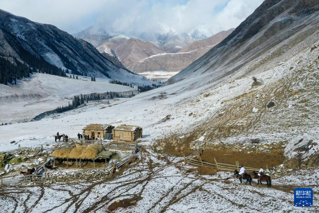 Aerial photo taken on Jan. 25, 2022 shows doctors on their way to visit patients at the Akyaz Valley in Zhaosu County, northwest China's Xinjiang Uygur Autonomous Region. Herdsmen in Xinjiang had lived a nomadic life for centuries. Under a housing project to benefit hundreds of households of local herdsmen, local authorities have initiated construction of supporting facilities to help herdsmen's settlement. It helps herdsmen to start a new life with better medical, educational, cultural and health facilities. (Xinhua/Ding Lei)