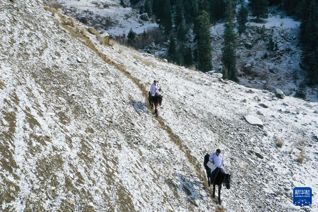 Aerial photo taken on Jan. 25, 2022 shows doctors on their way to visit patients at the Akyaz Valley in Zhaosu County, northwest China's Xinjiang Uygur Autonomous Region. Herdsmen in Xinjiang had lived a nomadic life for centuries. Under a housing project to benefit hundreds of households of local herdsmen, local authorities have initiated construction of supporting facilities to help herdsmen's settlement. It helps herdsmen to start a new life with better medical, educational, cultural and health facilities. (Xinhua/Ding Lei)