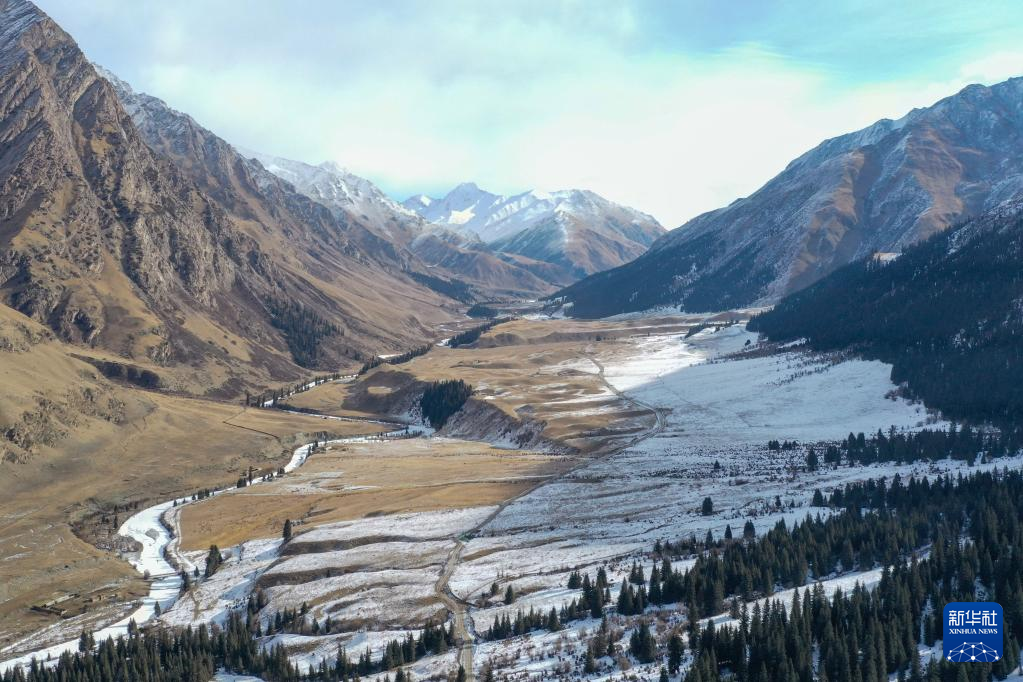 Aerial photo taken on Jan. 26, 2022 shows the scenery of Akyaz Valley in Zhaosu County, northwest China's Xinjiang Uygur Autonomous Region. Herdsmen in Xinjiang had lived a nomadic life for centuries. Under a housing project to benefit hundreds of households of local herdsmen, local authorities have initiated construction of supporting facilities to help herdsmen's settlement. It helps herdsmen to start a new life with better medical, educational, cultural and health facilities. (Xinhua/Ding Lei)