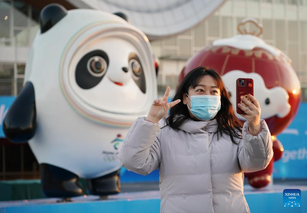 A visitor takes a selfie with decorative installations with the theme of 2022 Beijing Winter Olympics at Yanqing Railway Station in Yanqing District of Beijing, capital of China, Jan. 29, 2022. (Xinhua/Ren Chao)