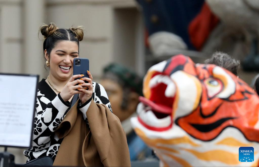 A woman takes photos during a Chinese Lunar New Year celebration held in National Maritime Museum in London, Britain, Jan. 29, 2022. (Xinhua/Li Ying)