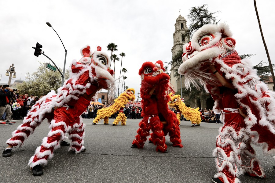 People perform a lion dance during the Riverside Lunar Festival celebrations in Riverside County, California, the United States, on Jan. 29, 2022. (Xinhua)