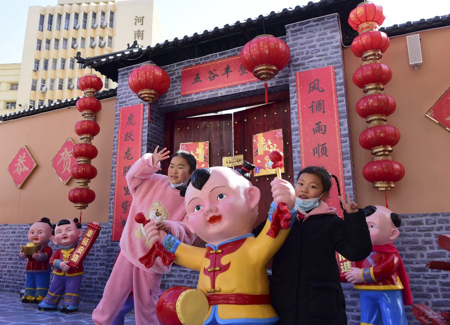Children pose for a photo with festive decorations in Zhengzhou, central China's Henan Province, Jan. 31, 2022. The Spring Festival falls on Feb. 1 this year. (Xinhua/Zhu Xiang)