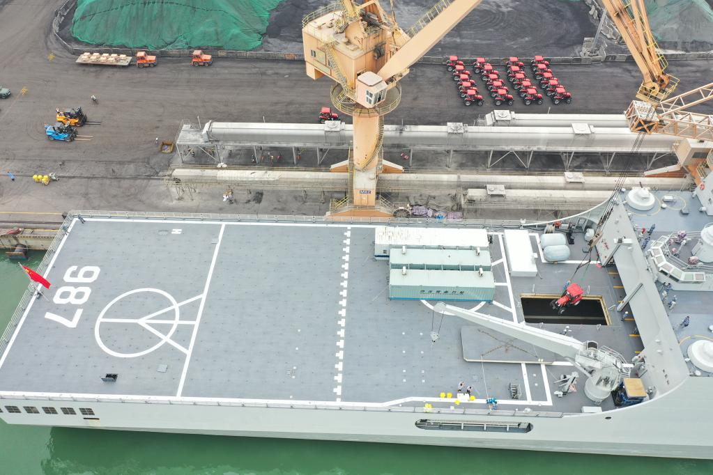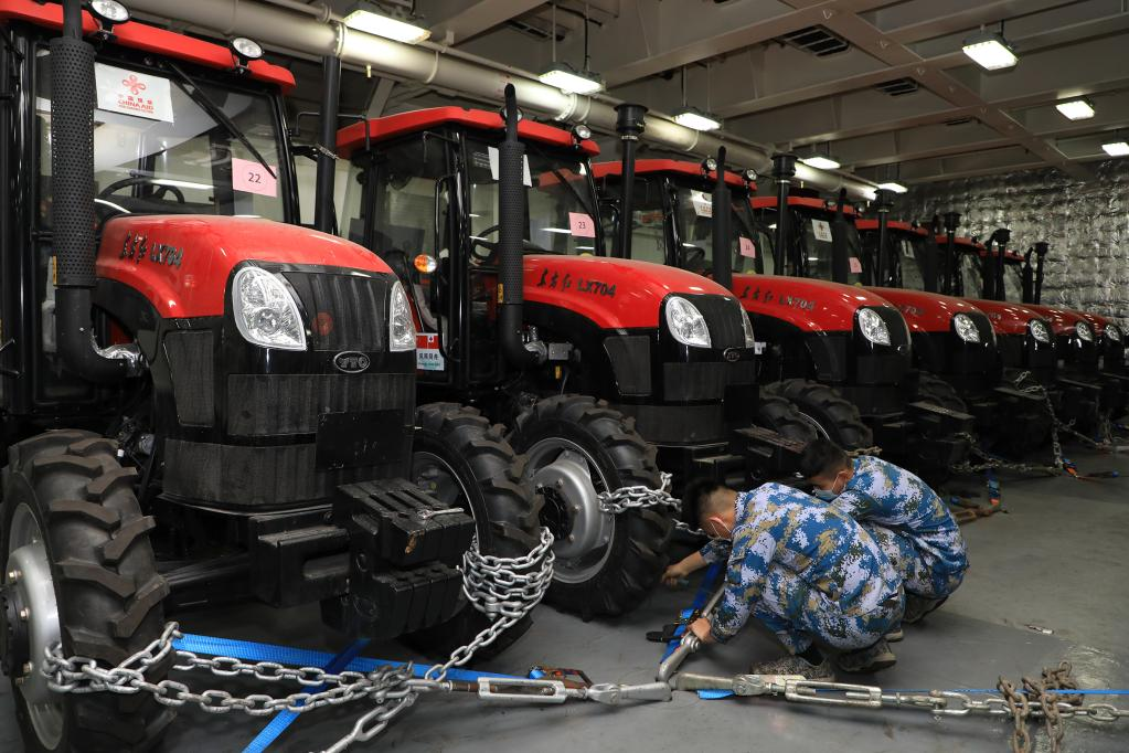 Members of People's Liberation Army (PLA) Navy fasten tractors on a ship delivering relief supplies to Tonga, Jan. 30, 2022. (Photo by Xue Chengqing/Xinhua)