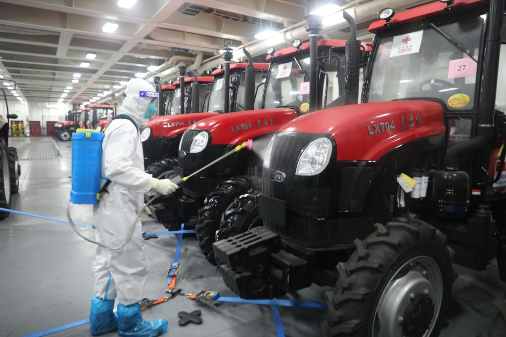 A staff member disinfects tractors on a ship delivering relief supplies to Tonga, Jan. 28, 2022. (Photo by Wang Lei/Xinhua)