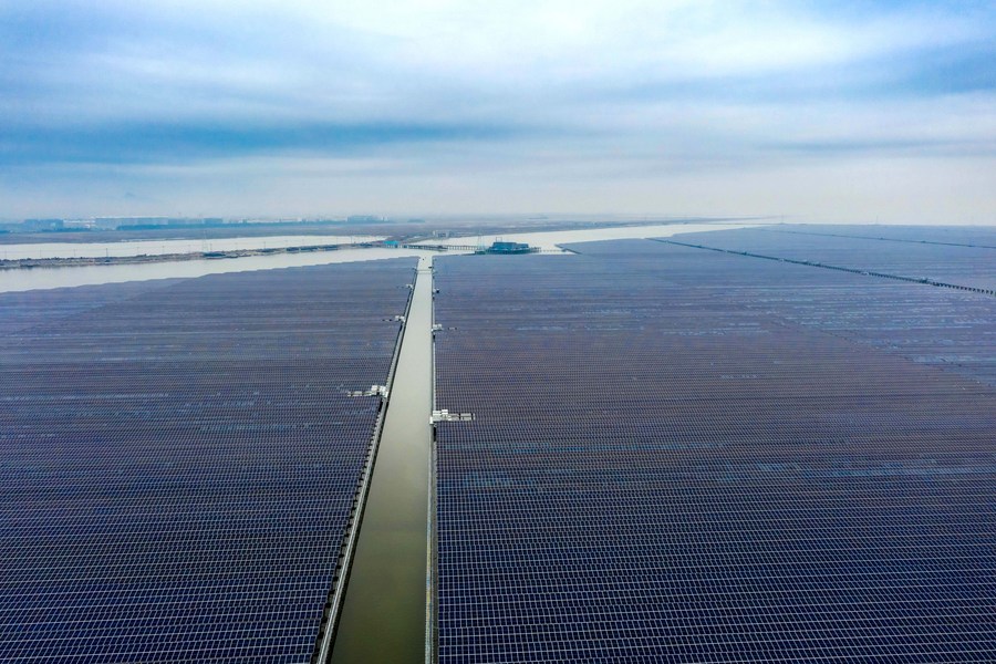 Aerial photo taken on Dec. 15, 2021 shows a 550 megawatts photovoltaic (PV) power station in Wenzhou, east China's Zhejiang Province. (Xinhua/Xu Yu)