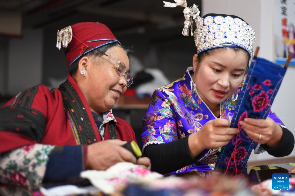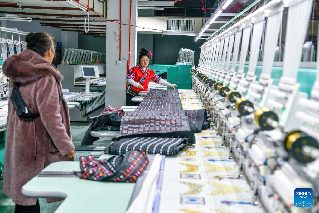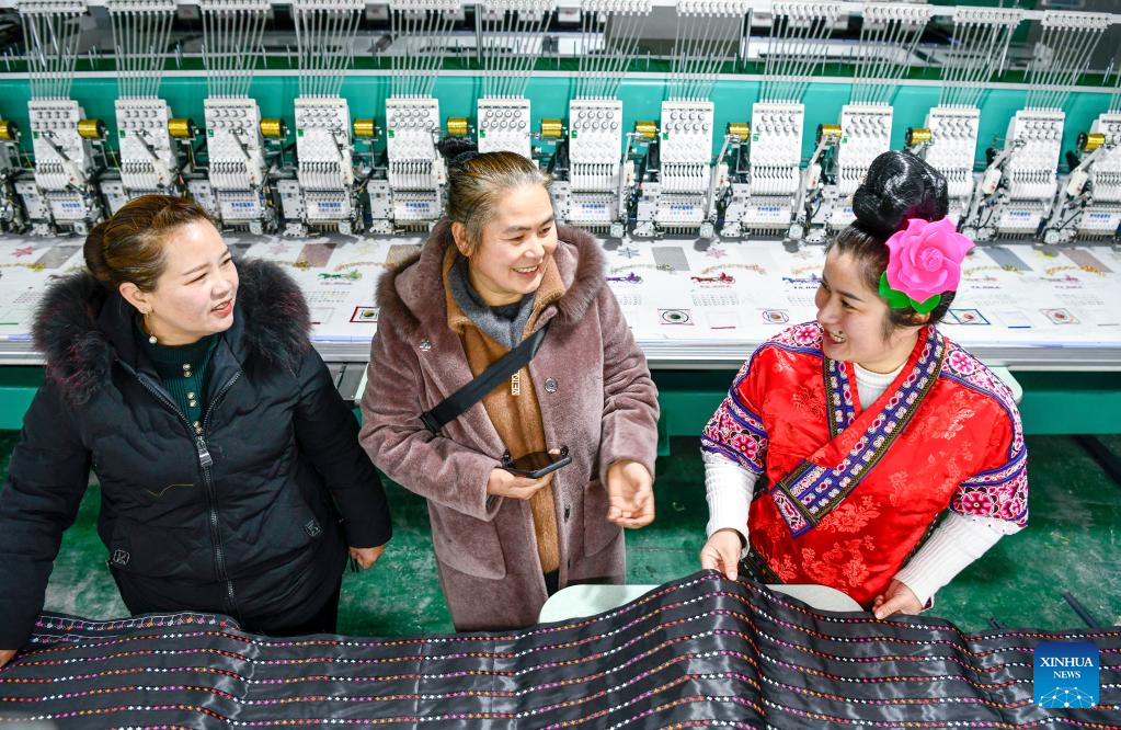 Yang Mei (2nd, R) and a staff member (1st, R) give details about their embroidery to customers at a garment factory in Kaili, southwest China's Guizhou Province, Jan. 30, 2022. Kaishao Village, embroiderer Yang Mei's hometown, used to be impoverished due to its poor soil and limited transport conditions. Lots of villagers here chose to work as immigrant workers in other places. In 2016, thanks to local poverty alleviation policies, Yang Mei's family got a chance to move to their new home at a relocation site in Kaili. With the help from skill training sessions and supportive funding from government, Yang started her own business by establishing a garment factory in 2018. The factory makes local ethnic clothing, work outfits and dancing clothes. Currently, the factory has employed about 100 relocated people. She also initiated an embroidery cooperative, aiming to help boost the incomes of those embroiders who have to work from home. When it comes to her New Year wish, Yang hopes her business can grow bigger and all her relocated fellows' incomes continue to increase in the Year of the Tiger. (Xinhua/Yang Wenbin)