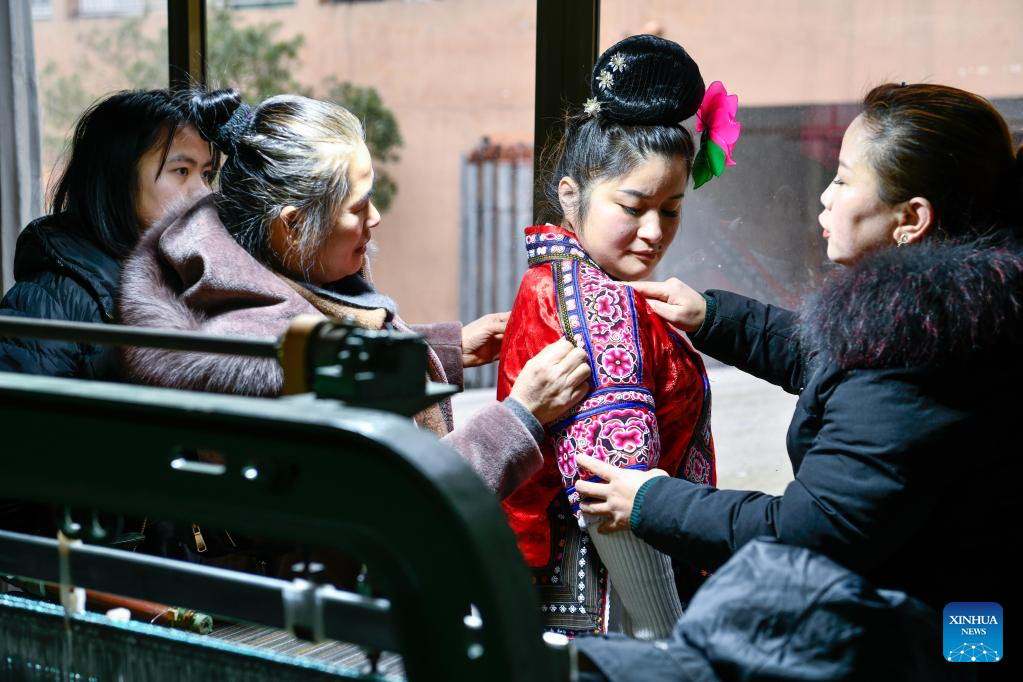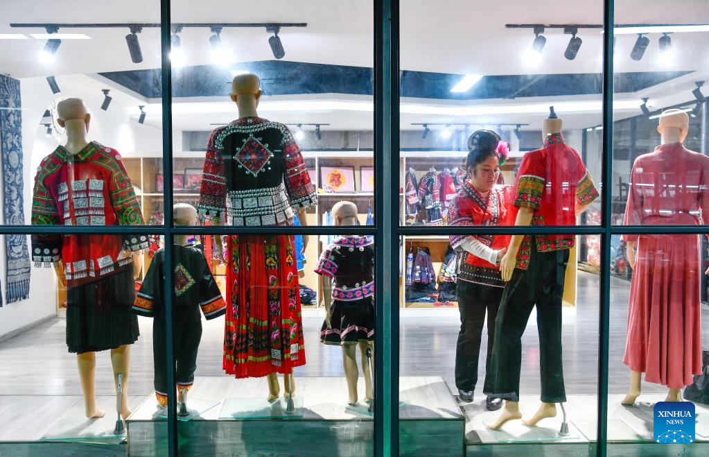 Yang Mei arranges clothes on models at her garment factory in Kaili, southwest China's Guizhou Province, Jan. 30, 2022. Kaishao Village, embroiderer Yang Mei's hometown, used to be impoverished due to its poor soil and limited transport conditions. Lots of villagers here chose to work as immigrant workers in other places. In 2016, thanks to local poverty alleviation policies, Yang Mei's family got a chance to move to their new home at a relocation site in Kaili. With the help from skill training sessions and supportive funding from government, Yang started her own business by establishing a garment factory in 2018. The factory makes local ethnic clothing, work outfits and dancing clothes. Currently, the factory has employed about 100 relocated people. She also initiated an embroidery cooperative, aiming to help boost the incomes of those embroiders who have to work from home. When it comes to her New Year wish, Yang hopes her business can grow bigger and all her relocated fellows' incomes continue to increase in the Year of the Tiger. (Xinhua/Yang Wenbin)
